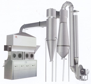 沸騰干燥機,又稱流化床,它是由空氣過濾器、加熱器、沸騰床主機、旋風分離器、布袋除塵器、高壓離心風機、操作臺組成,由于干燥物料的性質(zhì)不同,配套除塵設備時,可按需要考慮,可同時選擇旋風分離器,布袋除塵器,也可選擇其中一種,一般來說比重較大的如沖劑及顆粒物料干燥只需選擇旋風分離器,比重較輕的小顆粒狀和粉狀物料需配套布袋除塵器,并備有氣力送料裝置及皮帶輸送機供選擇。